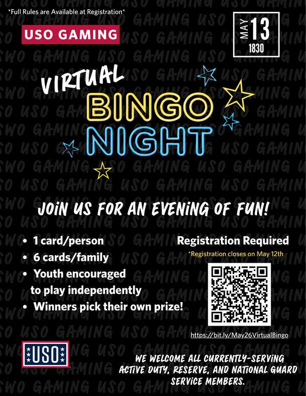Join us for Virtual Bingo! Event is open to all currently-serving active duty, reserve, and National Guard service members. 1 card/person, max 6 cards/family. Youth can participate with their own cards (versus sharing with an adult) as long as they are able to play their own card.